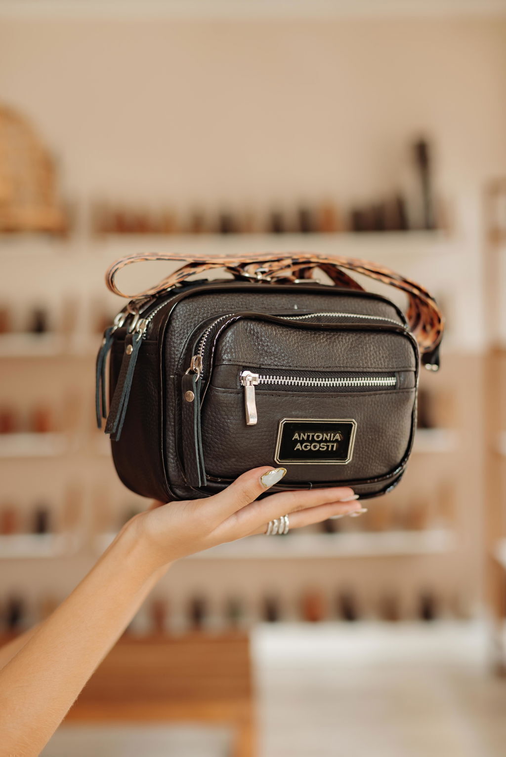• Detalles: Bandolera de cuero con triple acceso de cierre metálico. Interior forrado con tela personalizada de la marca, bolsillo interno. Correa larga sublimada regulable al frente con bolsillo y chapa resinada Antonia Agosti.